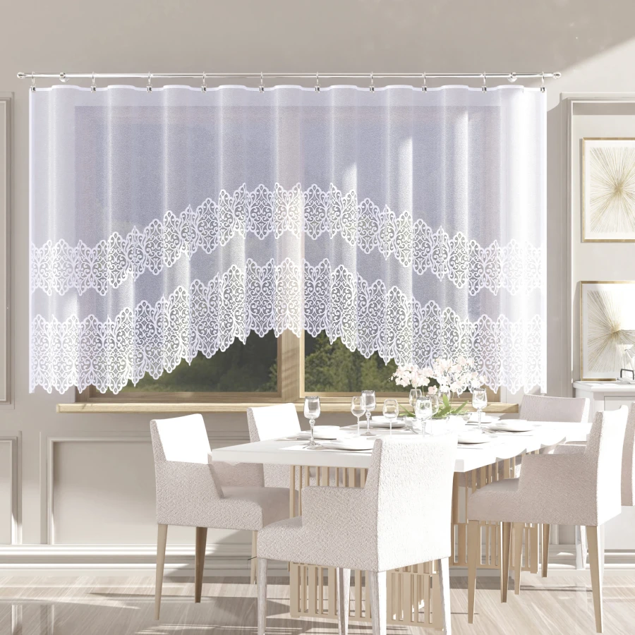 - Dekoracyjny wzór ornamenty oraz podcięcie nadają firance wyrazisty i klasyczny wygląd.