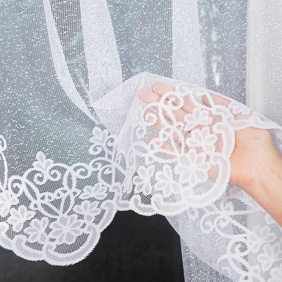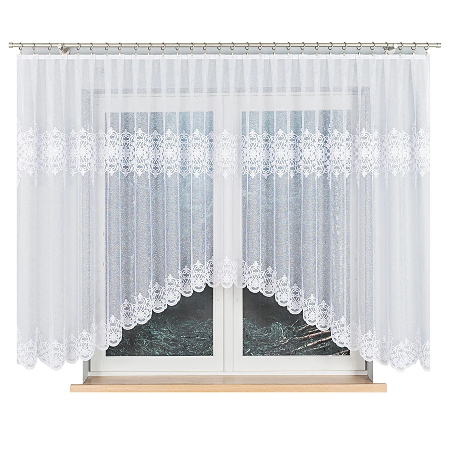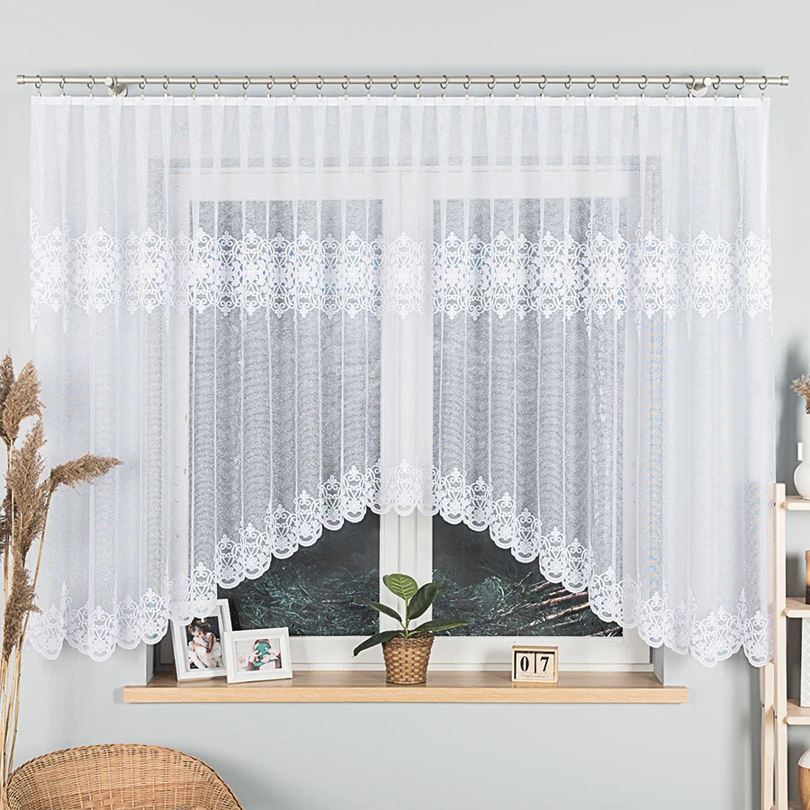Model ŻANETA to firanka gotowa z podcięciem wykonana z białego żakardu w rozmiarze 450x155 cm. Klasyczna forma sprawia, że produkt prezentuje się lekko i estetycznie, a dekoracyjna bordiura falowana na dole podkreśla jego wykończenie. Firanka została uszyta w 100% z poliestru, dzięki czemu stanowi praktyczne rozwiązanie do codziennego użytkowania. Góra została wykończona fabrycznie, bez taśmy, a boki nie wymagają dodatkowego obszycia. Model jest przystosowany do zawieszenia na żabki.