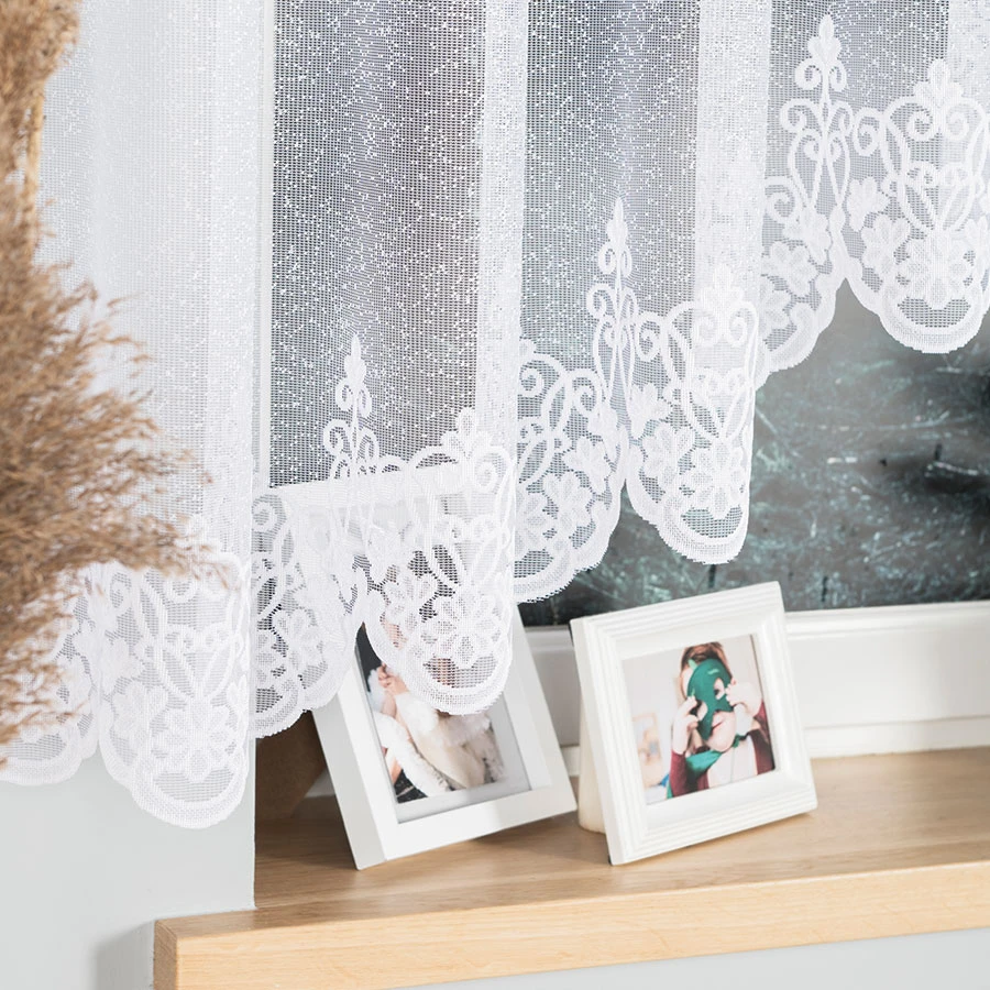 - Klasyczny charakter – biały kolor, żakardowy materiał i prosta forma dobrze wpisują się w ponadczasowy wygląd firanki.