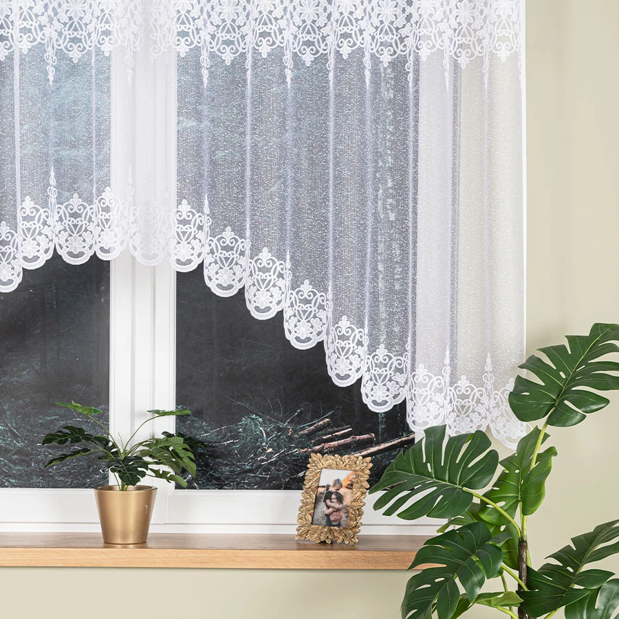 - Dekoracyjne wykończenie dołu – falowana bordiura podkreśla ozdobny wygląd firanki.