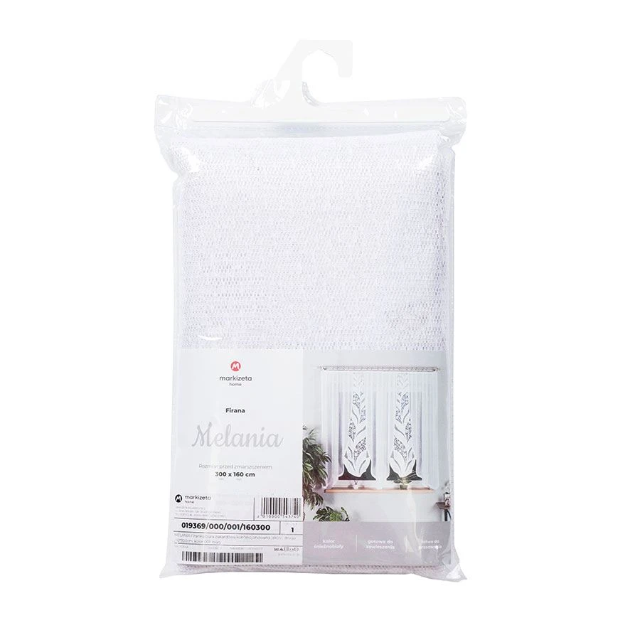 MELANIA to biała firanka gotowa z podcięciem, uszyta z żakardu i przygotowana w rozmiarze 500x160 cm. Klasyczna forma sprawia, że model prezentuje się lekko i estetycznie, a falowana bordiura na dole nadaje całości dekoracyjnego wykończenia. Firanka została wykonana w 100% z poliestru, ma gramaturę 80-90 g/m2 i jest przeznaczona do zawieszenia na żabki. Góra została wykończona fabrycznie, bez taśmy, a boki nie wymagają dodatkowego obszycia.