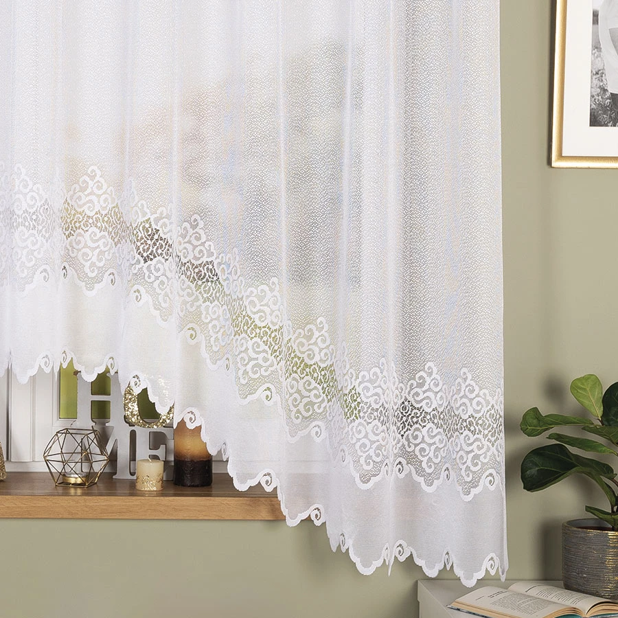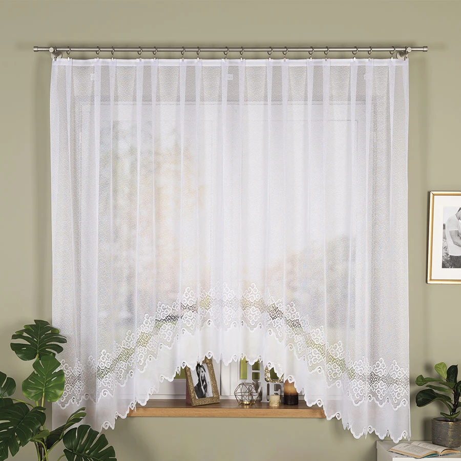 MODEL MODESTA to biała firanka gotowa z podcięciem, wykonana z żakardu i utrzymana w klasycznym stylu. Ornamentowy wzór oraz bordiura falowana u dołu nadają jej dekoracyjny wygląd, widoczny szczególnie po zawieszeniu w oknie. Rozmiar 300x180 cm sprawia, że model dobrze prezentuje się jako wyrazista ozdoba strefy okiennej. Produkt został uszyty w 100% z poliestru, a jego gramatura wynosi 80–90 g/m2.