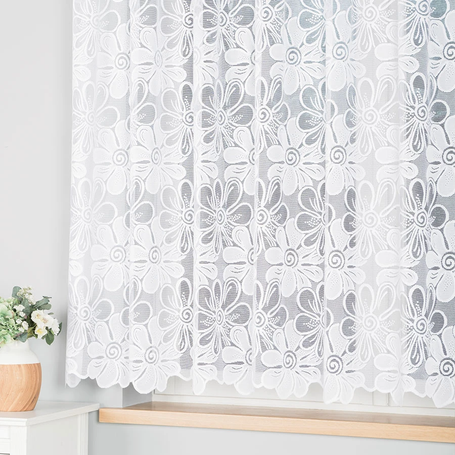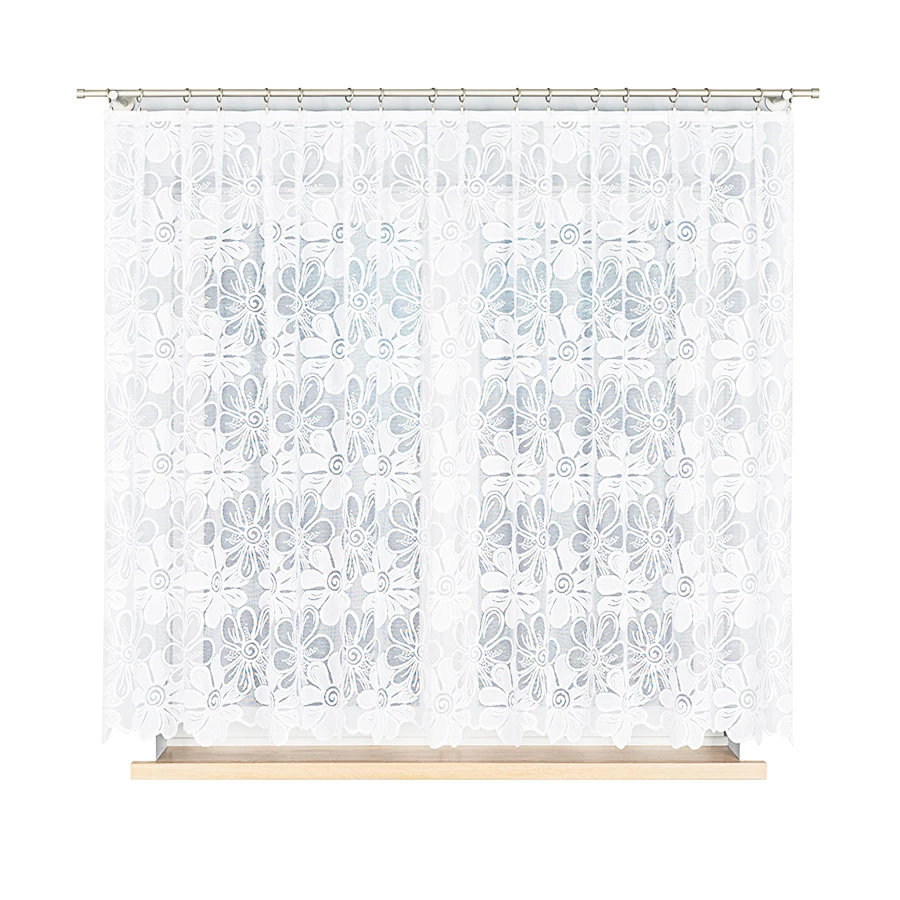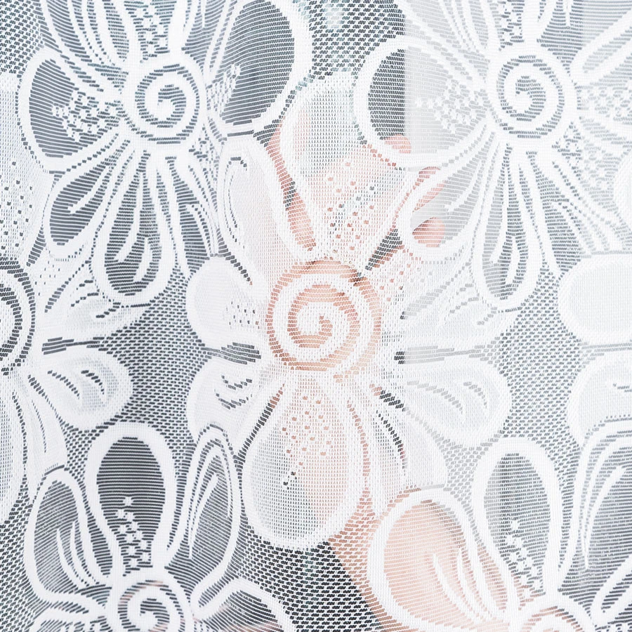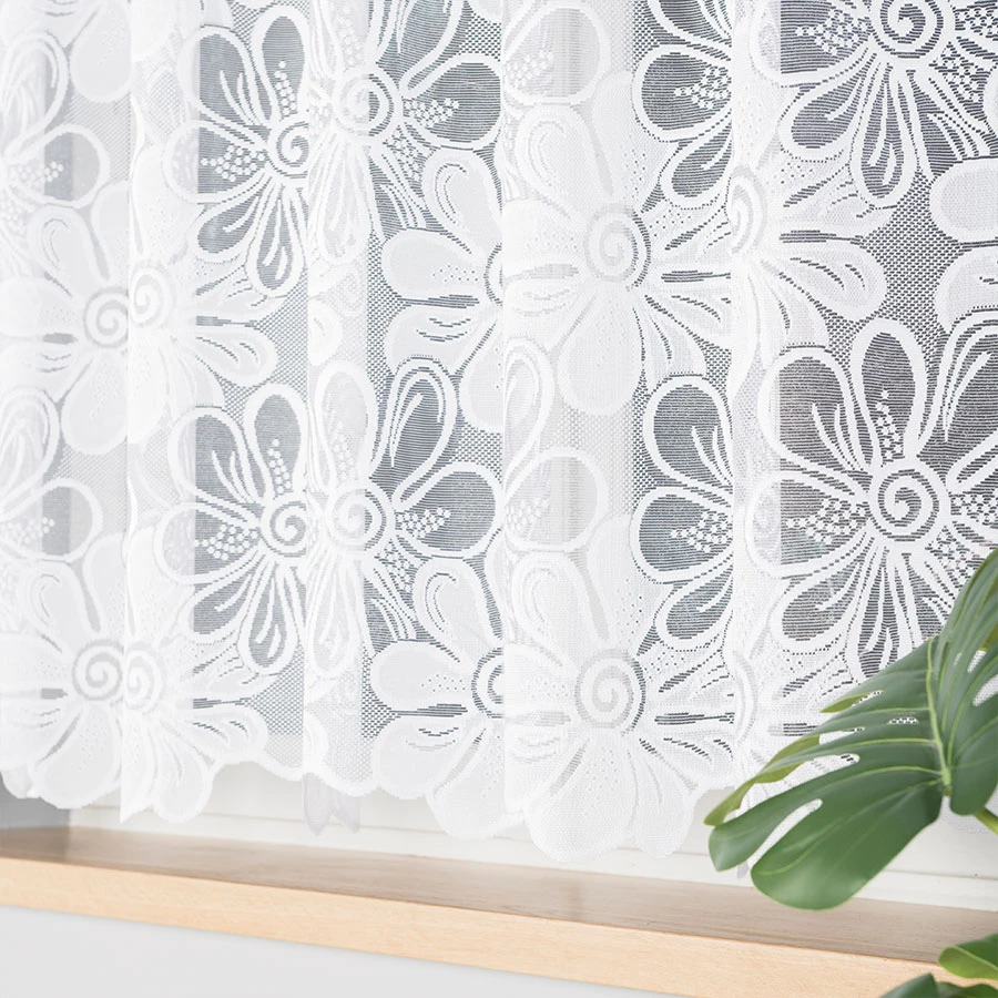 Kwiatowy wzór nadaje firance dekoracyjny wygląd i podkreśla jej klasyczny charakter.