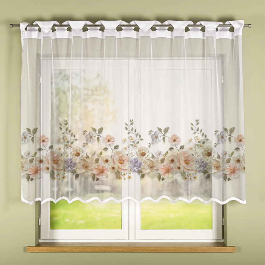 Wybierz model KWIATY Z EFEKTEM WYSZYWANIA i postaw na gotową firankę żakardową 240x140 cm w ponadczasowym wydaniu.