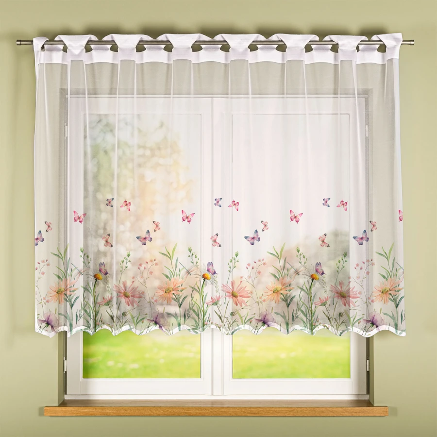 Firanka żakardowa ŁĄKA Z MOTYLAMI sprawdzi się jako dekoracja okienna w pomieszczeniach, w których liczy się lekki, ozdobny akcent. Wielokolorowa kolorystyka, kwiatowy wzór oraz falowane wykończenie dołu tworzą spójną kompozycję widoczną po zawieszeniu.