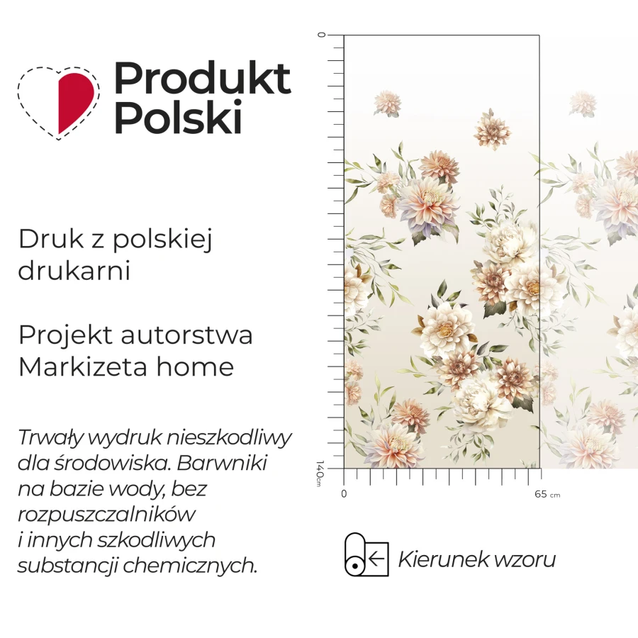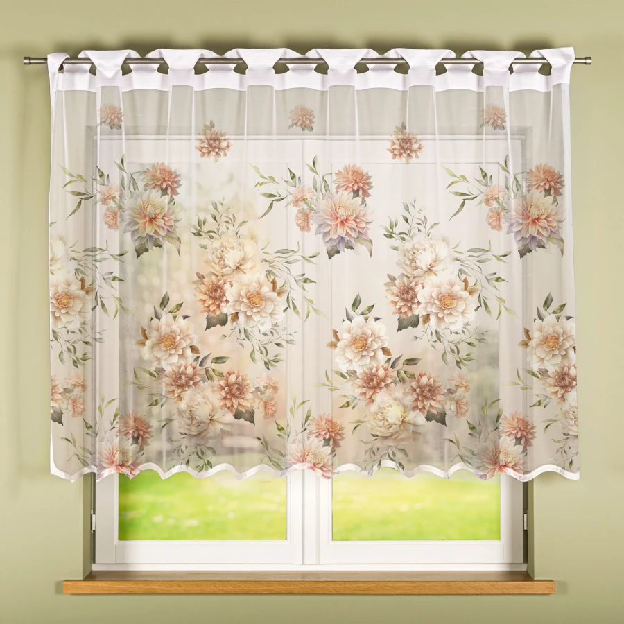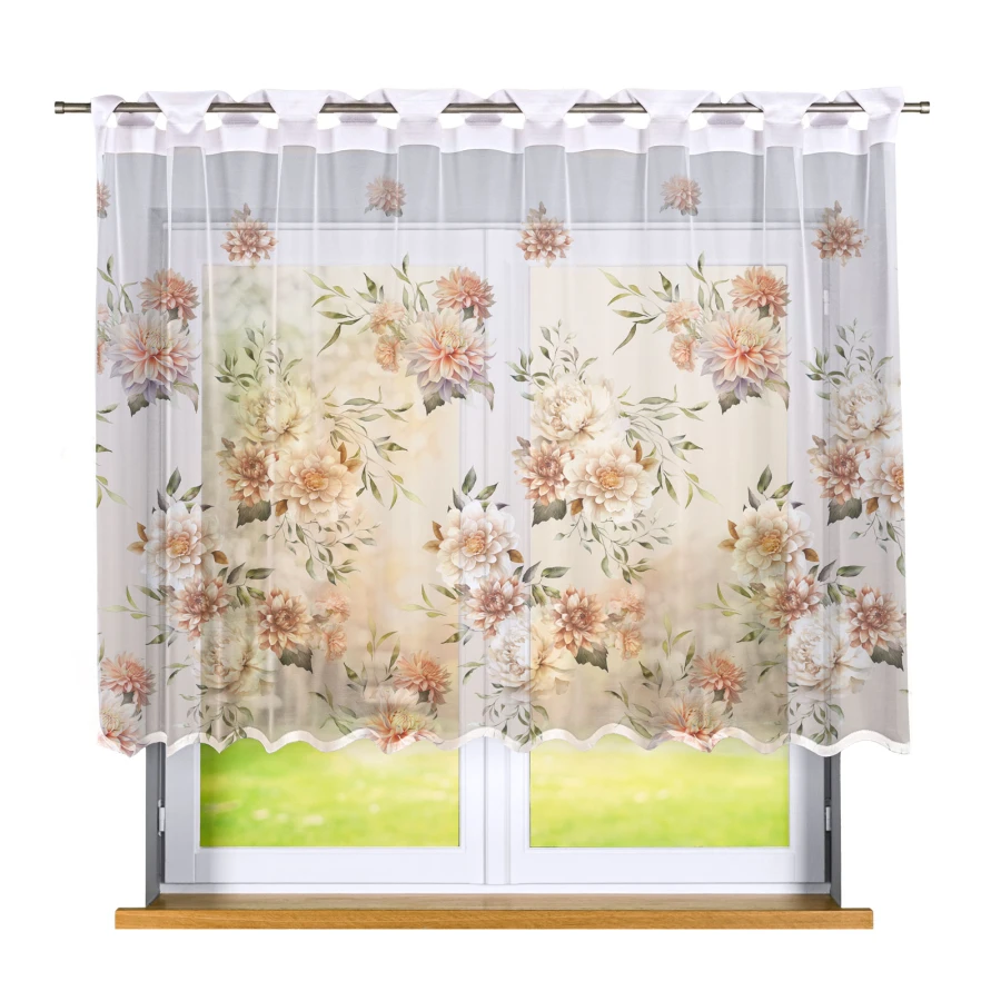 Kwiatowy motyw wyraźny wzór kwiatów stanowi ozdobny akcent widoczny na całej powierzchni firanki.