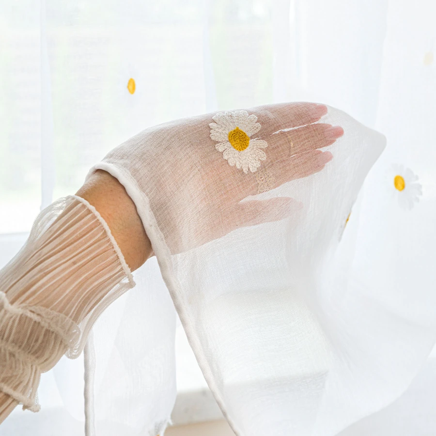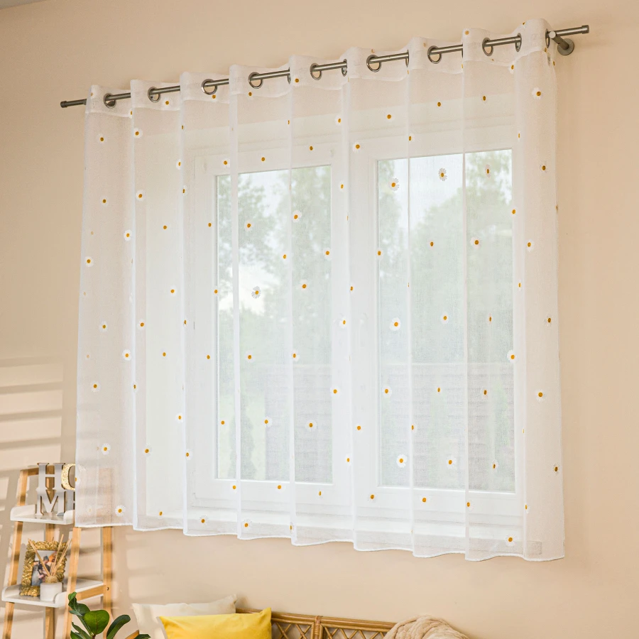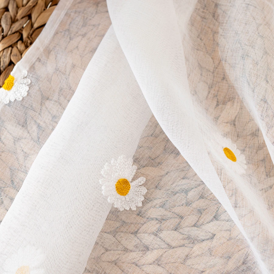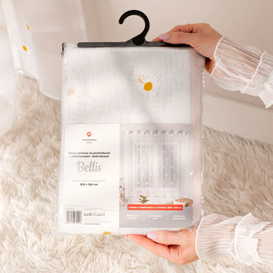 BELLIS Firana gotowa na etaminie w stokrotki, haftowana na srebrnych przelotkach, z ołowianką szerokość 300 x wysokość 160