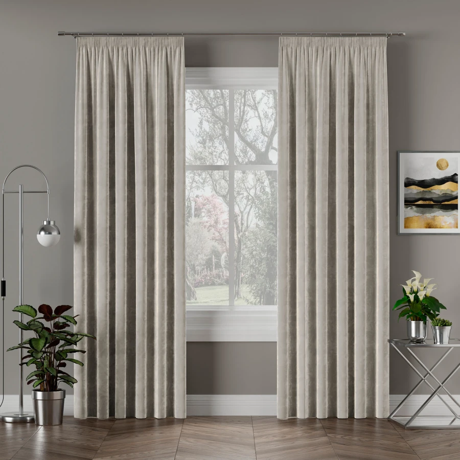 Wybierz model VELVI i postaw na gotową welurową zasłonę w pastelowym szarym odcieniu.