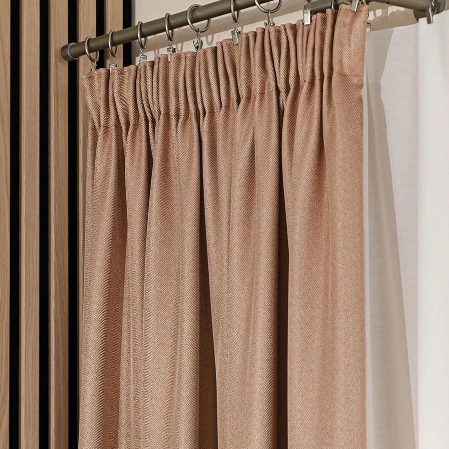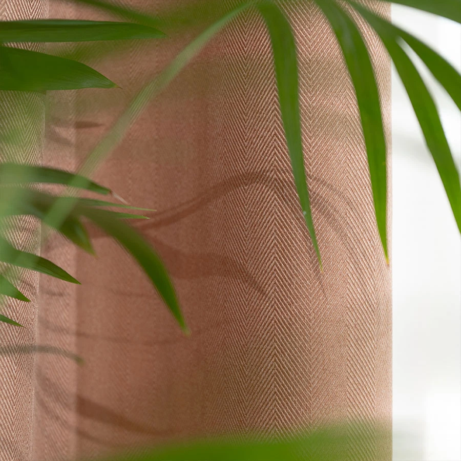 Strukturalna tkanina materiał z wyraźną fakturą i wzorem jodełki nadaje zasłonie charakterystyczny wygląd.