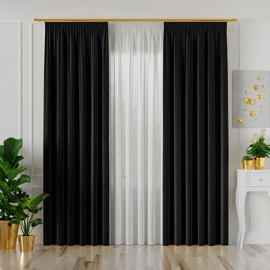 Zasłona VELVI sprawdzi się jako gotowa dekoracja okienna w pomieszczeniach, w których liczy się elegancki wygląd gładkiej, czarnej tkaniny. Dzięki uniwersalnym sposobom zawieszania łatwo dopasować ją do posiadanego karnisza lub systemu mocowania.