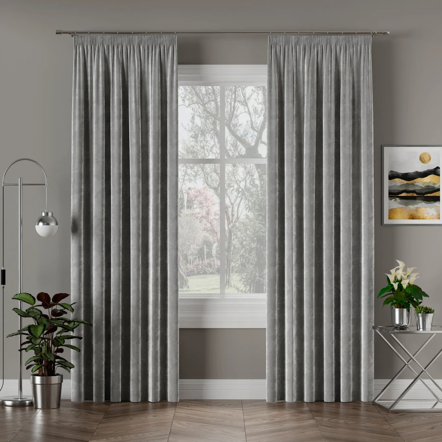 Wybierz model VELVI i postaw na gotową zasłonę z weluru w szarym kolorze.
