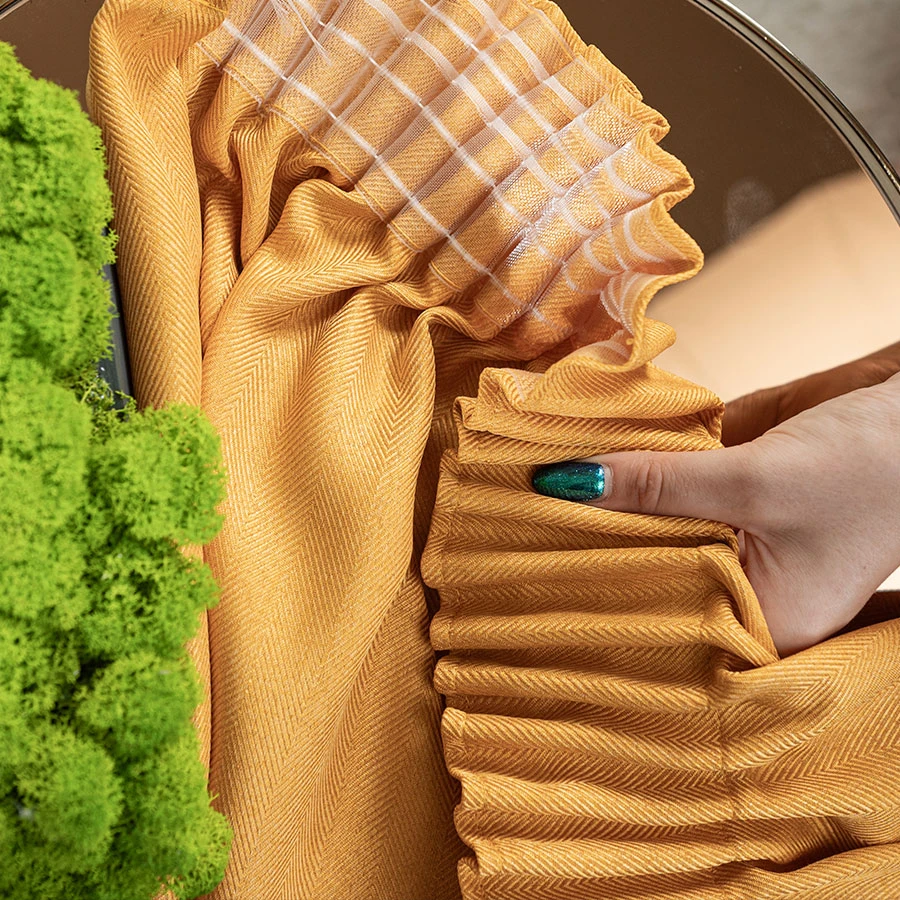 Model JODEŁKA to gotowa zasłona wykonana z tkaniny dekoracyjnej w żółtym kolorze. Rozmiar 140x250 cm sprawia, że produkt dobrze sprawdzi się jako pojedyncza dekoracja okienna. Tkanina z 100% poliestru została starannie wykończona — boki są obszyte, dół obszyty, a góra wyposażona w taśmę marszczącą. Dzięki temu zasłona prezentuje się estetycznie i jest gotowa do zawieszenia zaraz po wyjęciu z opakowania.