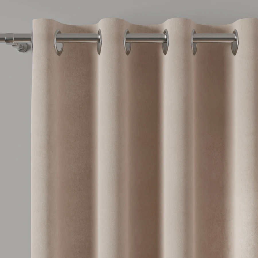 MILAS to gotowa zasłona na przelotkach, uszyta z welwetu w jasnym beżowym kolorze. Gładka powierzchnia tkaniny i nowoczesny styl sprawiają, że model dobrze prezentuje się w uporządkowanych, współczesnych wnętrzach. Rozmiar 140x260 cm pozwala wygodnie wykorzystać ją jako pojedynczą dekorację okienną. Przelotki umożliwiają szybkie zawieszenie na karniszu i pomagają uzyskać estetyczne, równe fale materiału.