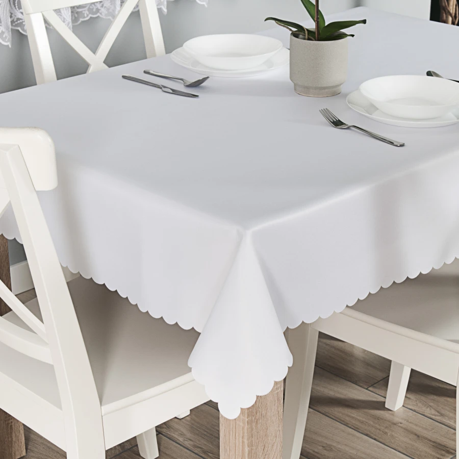 LARA to biały obrus wodoodporny z tkaniny, który łączy prosty, klasyczny wygląd z praktycznym zastosowaniem na co dzień. Gładka powierzchnia i brak zdobień sprawiają, że prezentuje się schludnie i ponadczasowo, a jasny kolor dobrze wpisuje się w różne aranżacje stołu. Rozmiar 140x330 cm pozwala wygodnie nakryć większy blat, zapewniając estetyczne wykończenie. Obrus został wykonany ze 100% poliestru, a jego gramatura wynosi 100-120 g/m2.