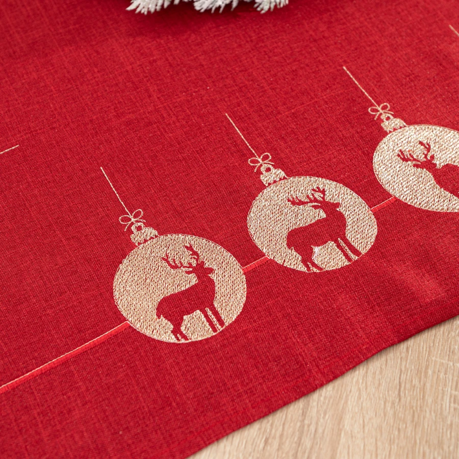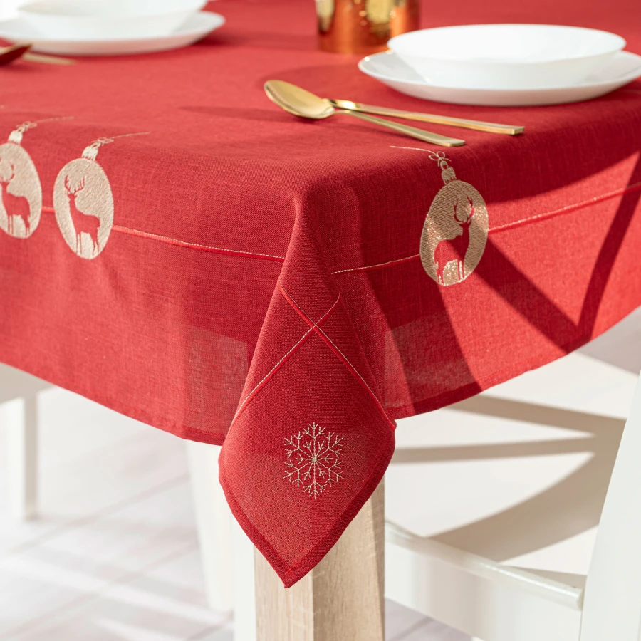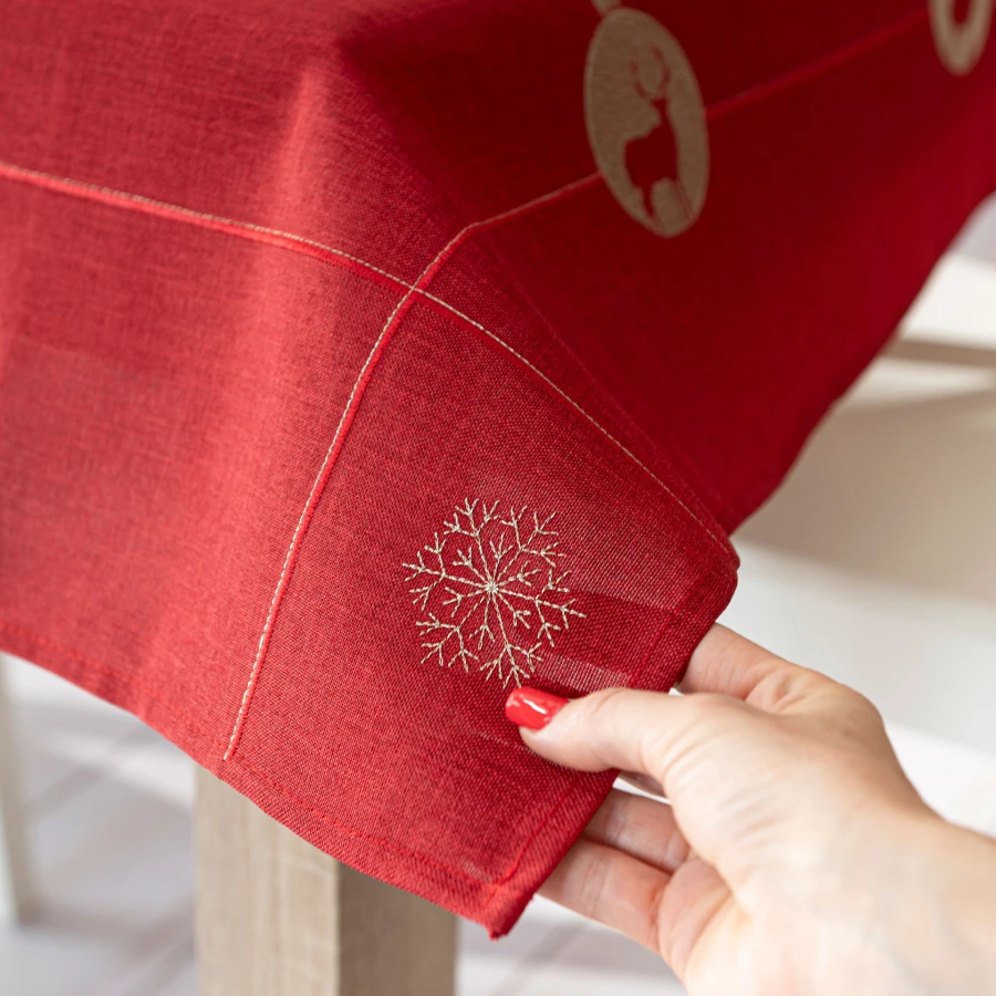 BŁYSZCZĄCY RENIFER to obrus z haftem, który łączy klasyczny wygląd z dekoracyjnym, bożonarodzeniowym wzorem. Czerwony kolor pięknie podkreśla świąteczny charakter aranżacji stołu, a haftowane detale widoczne na tkaninie nadają całości eleganckiego wykończenia. Model o rozmiarze 140x220 cm został wykonany z tkaniny o składzie 100% poliester. To propozycja dla osób, które szukają estetycznego i gotowego rozwiązania do sezonowej dekoracji jadalni lub salonu.