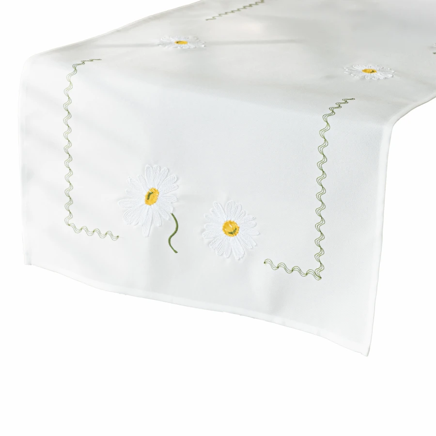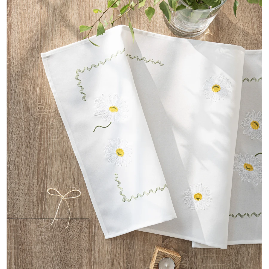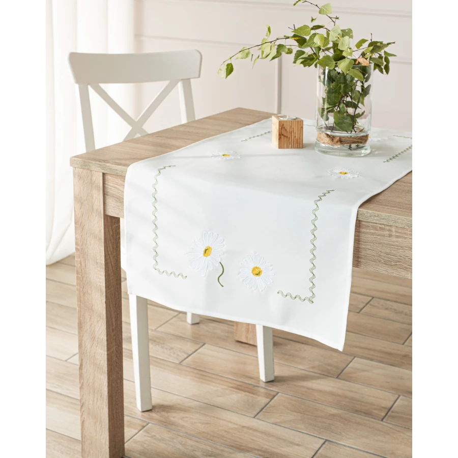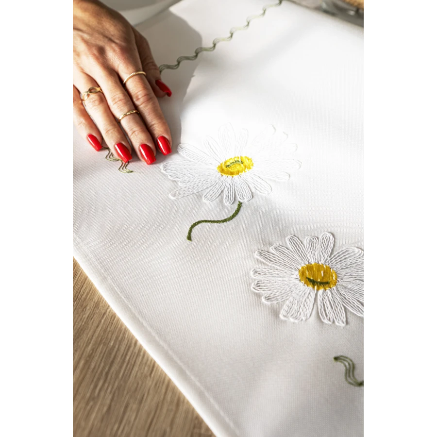 Wybierz biały bieżnik SUMMER z haftem i dodaj stołowi estetyczne, kwiatowe wykończenie.