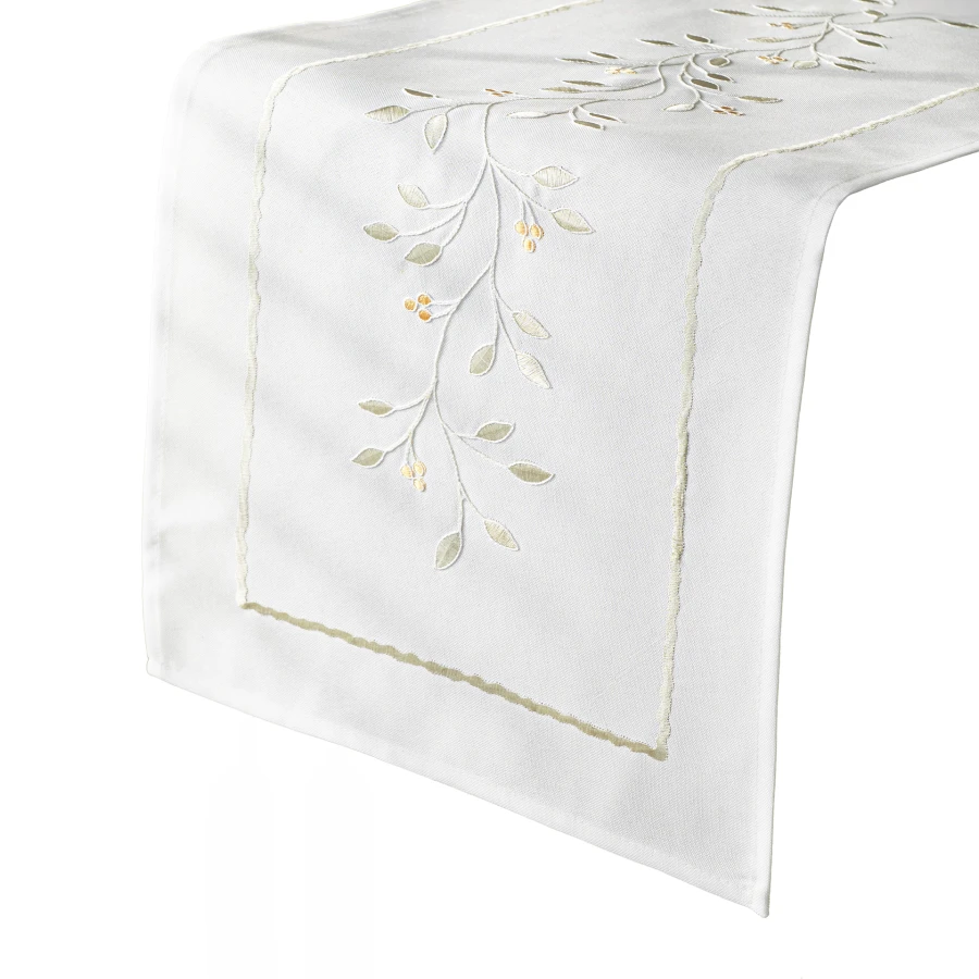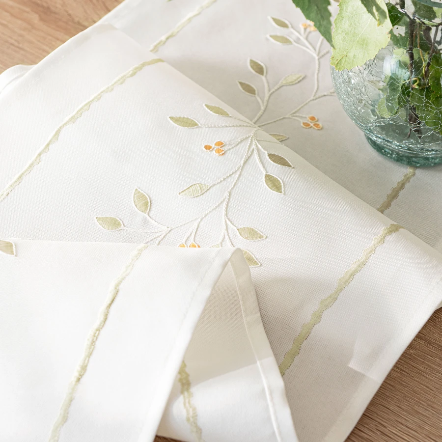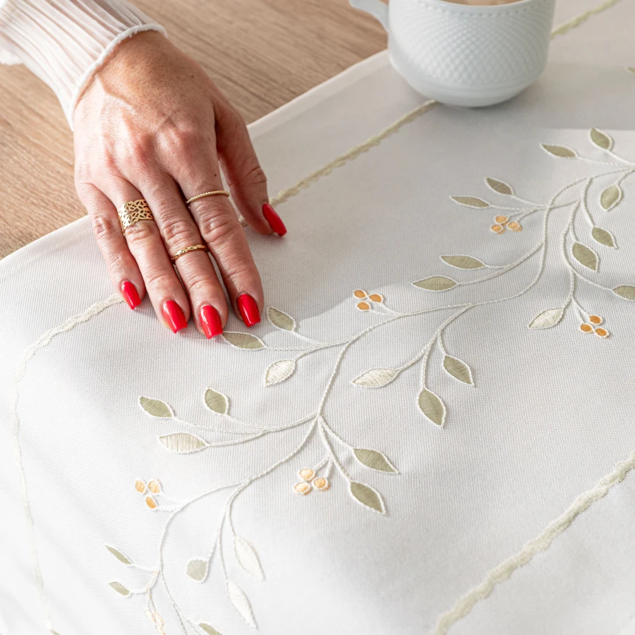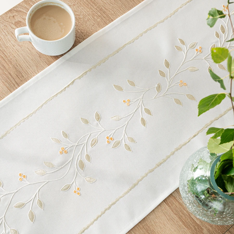 ZIELONA MELODIA to elegancki bieżnik z haftem, który łączy klasyczny wygląd z dekoracyjnym roślinnym wzorem. Model w białym kolorze został wykonany z tkaniny o składzie 100% poliester, dzięki czemu dobrze wpisuje się w codzienne i odświętne aranżacje stołu. Rozmiar 38x140 cm sprawia, że bieżnik może stanowić wyraźną, a zarazem subtelną ozdobę blatu. Delikatny haft z motywem roślin oraz staranne wykończenie podkreślają estetyczny charakter produktu.