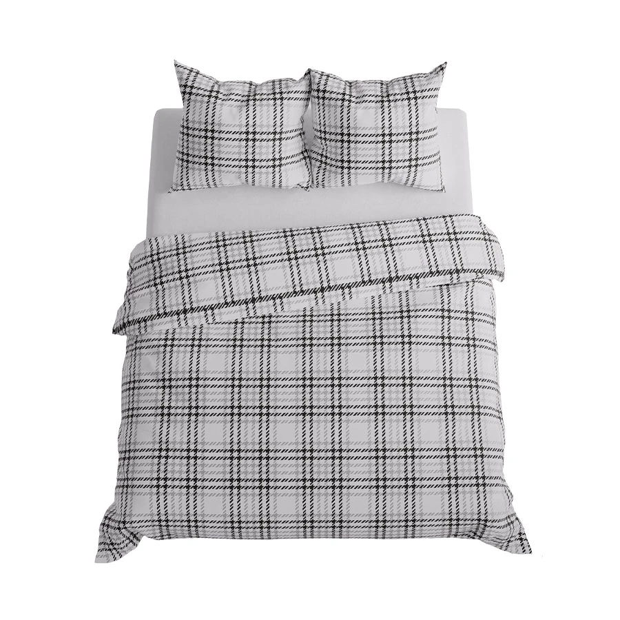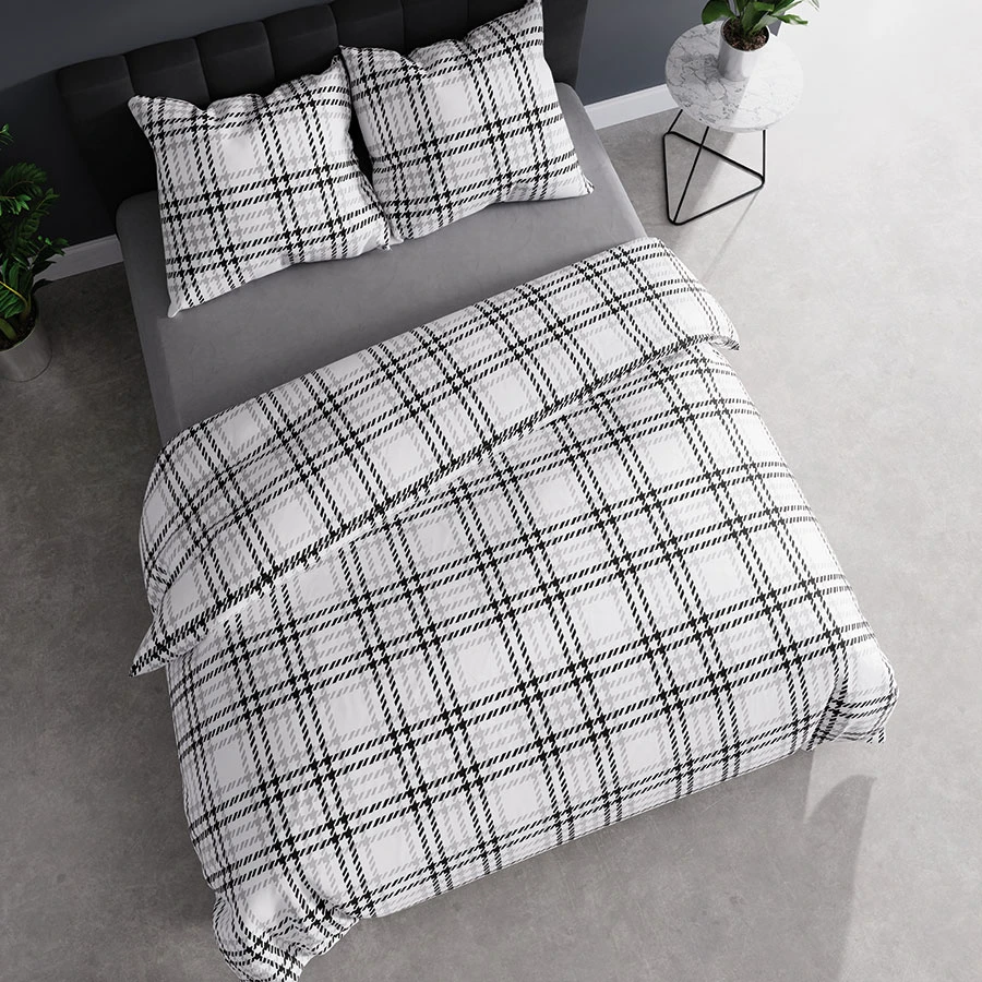 PETIT to komplet pościeli z satyny bawełnianej w rozmiarze 160x200 cm, utrzymany w białej kolorystyce z nadrukiem w kratę. Wykonany w 100% z bawełny komplet łączy naturalny skład z estetyką charakterystyczną dla nowoczesnych wnętrz. W zestawie znajduje się poszwa na kołdrę 160x200 cm oraz poszewki na poduszki 50x70 cm. Całość została wyposażona w zamek błyskawiczny, co ułatwia codzienne użytkowanie.