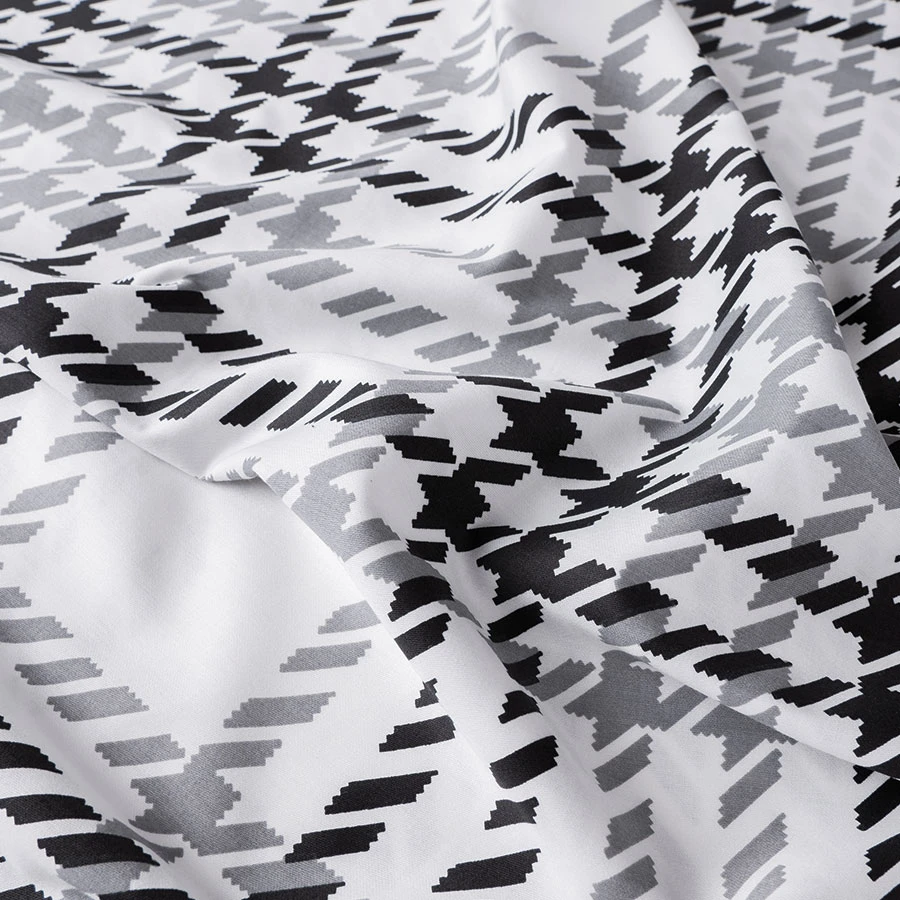 - Wyrazisty wzór biały komplet z nadrukiem w kratę przyciąga uwagę i nadaje całości nowoczesny charakter.