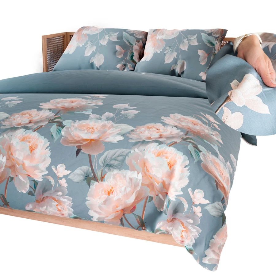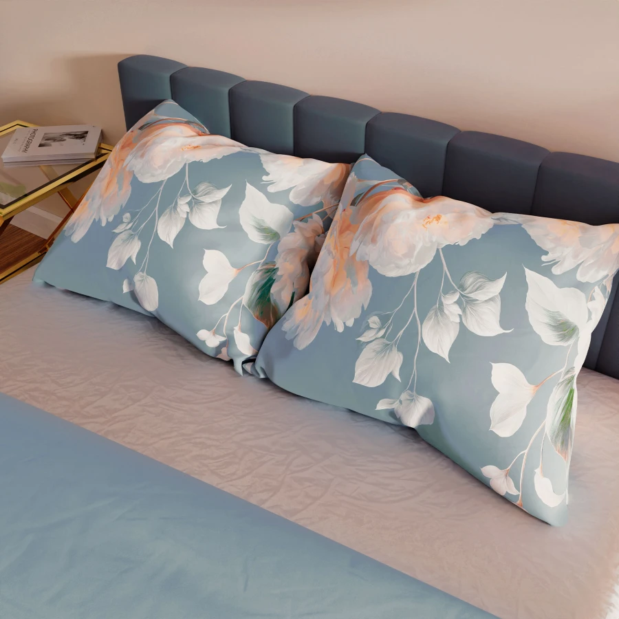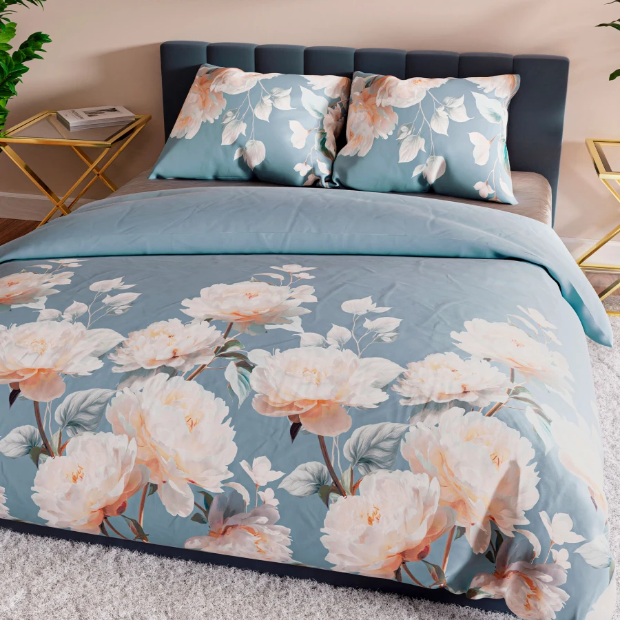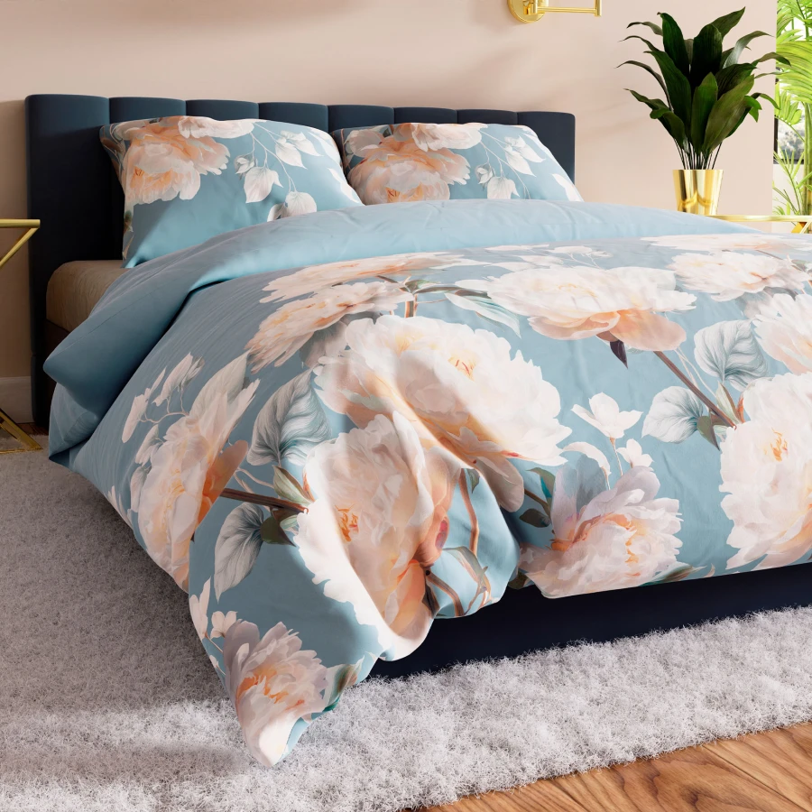 MELLORIA to komplet pościeli wykonany z satyny bawełnianej w niebieskim kolorze z kwiatowym nadrukiem. Zestaw w rozmiarze 160x200 cm łączy naturalny skład 100% bawełny z estetyką klasycznego wzoru. Delikatnie połyskująca powierzchnia satyny bawełnianej podkreśla nadruk kwiatów i nadaje całości elegancki wygląd. Komplet obejmuje poszwę na kołdrę 160x200 cm oraz poszewki na poduszki 50x70 cm. Praktyczne zapięcie na zamek błyskawiczny ułatwia zmianę pościeli i codzienne użytkowanie.