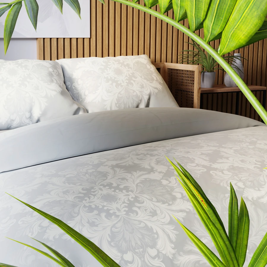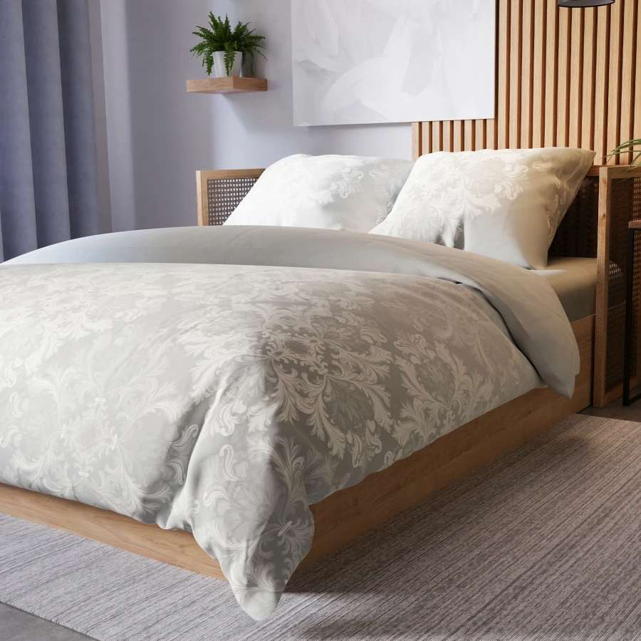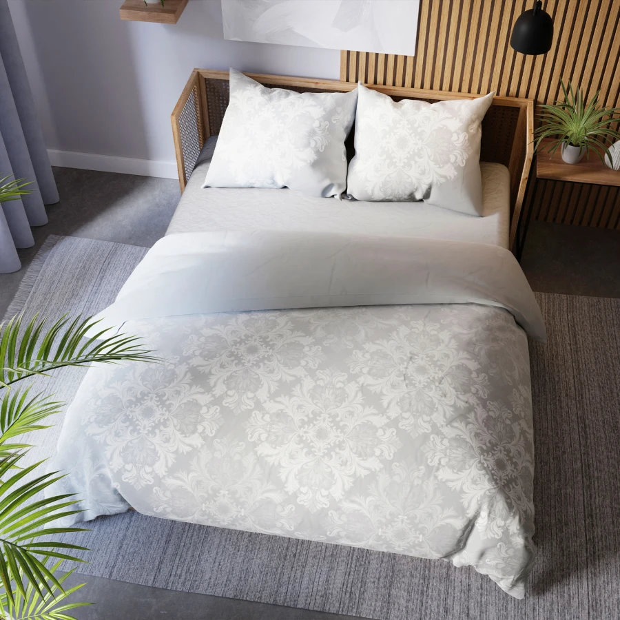 Komplet pościeli VELMORA będzie odpowiednim wyborem do sypialni urządzonej w klasycznym stylu. Jasna kolorystyka, ornamentowy wzór i starannie dobrane wymiary sprawiają, że zestaw dobrze prezentuje się na łóżku i wspiera estetyczne wykończenie strefy wypoczynku.