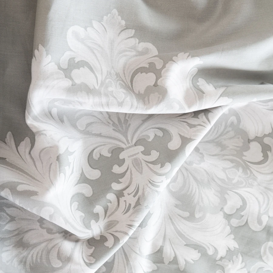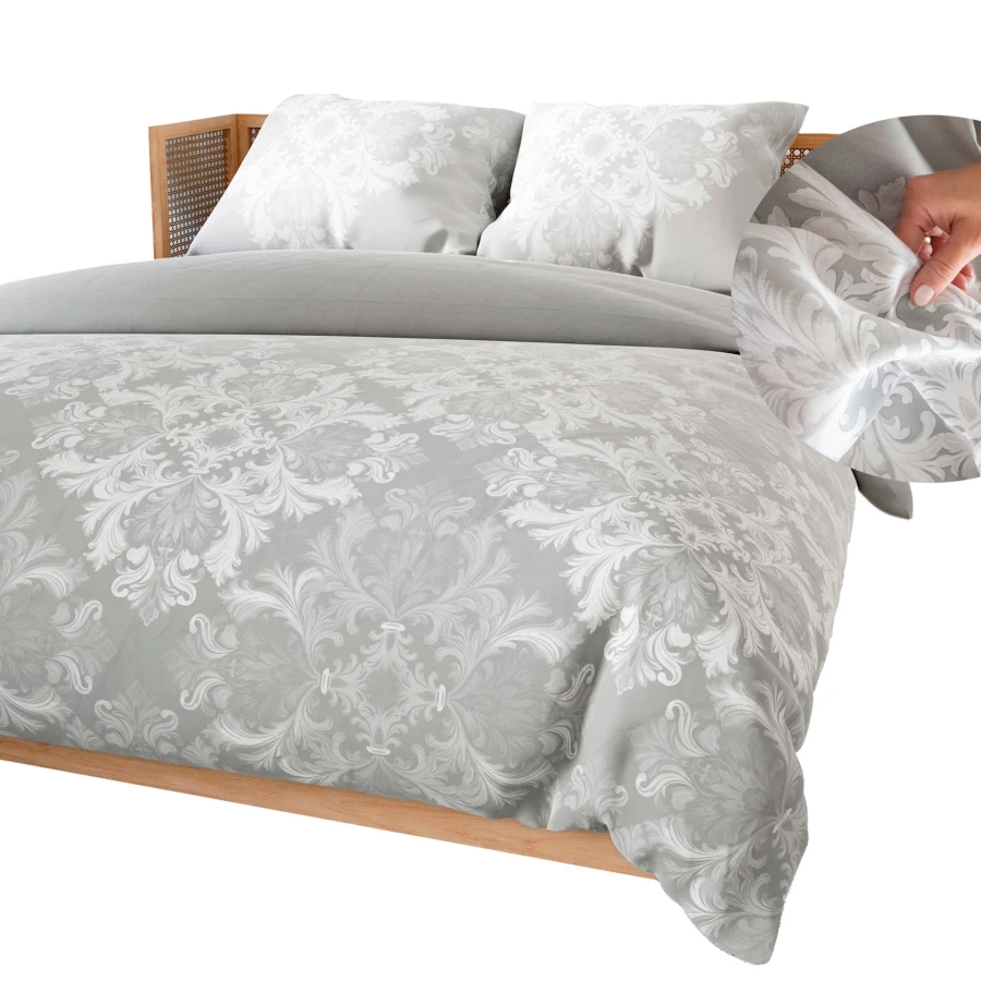 Komplet pościeli VELMORA sprawdzi się jako element wyposażenia sypialni urządzonej w klasycznym stylu. Jasna kolorystyka i ornamentowy motyw dobrze komponują się z różnymi aranżacjami wnętrz, a tolerancja wymiaru wynosi +/- 3%.