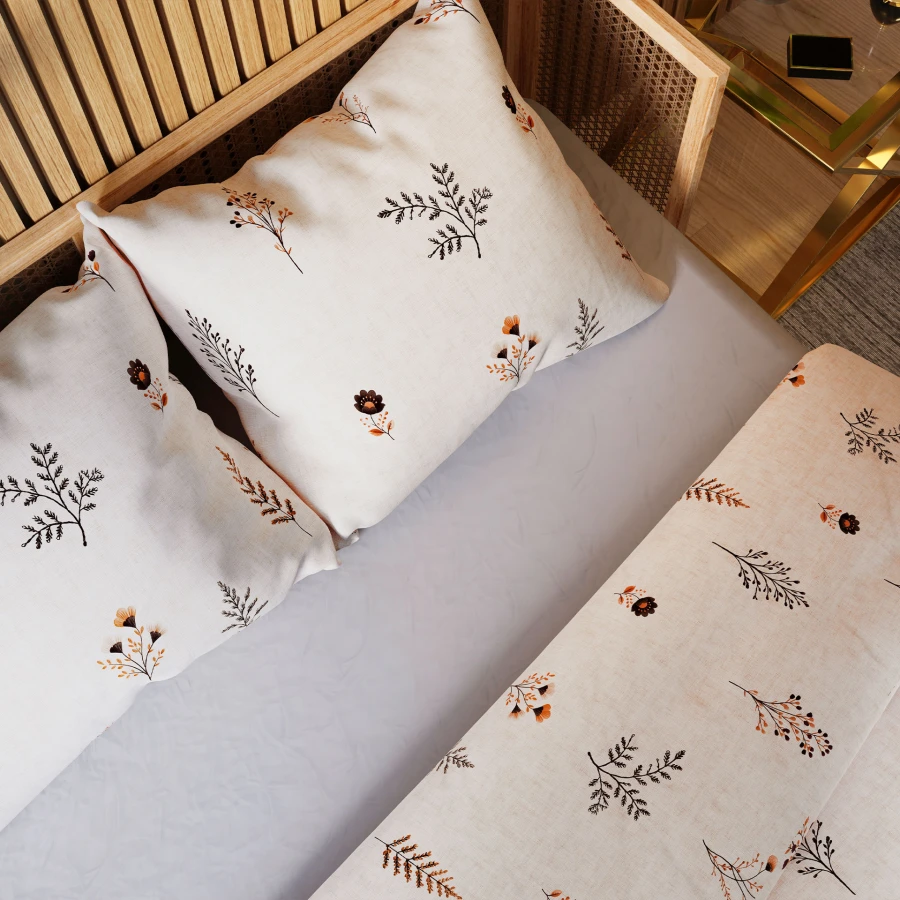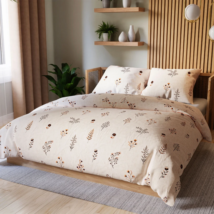 DUSORIA to komplet pościeli z satyny bawełnianej w beżowym kolorze, stworzony z myślą o estetycznym i spójnym wyglądzie sypialni. Delikatny roślinny nadruk dobrze współgra z jasną kolorystyką i stylem skandynawskim widocznym w aranżacji. Komplet wykonano ze 100% bawełny, a rozmiar poszwy na kołdrę wynosi 160x200 cm. W zestawie znajdują się również poszewki na poduszki w rozmiarze 50x70 cm.