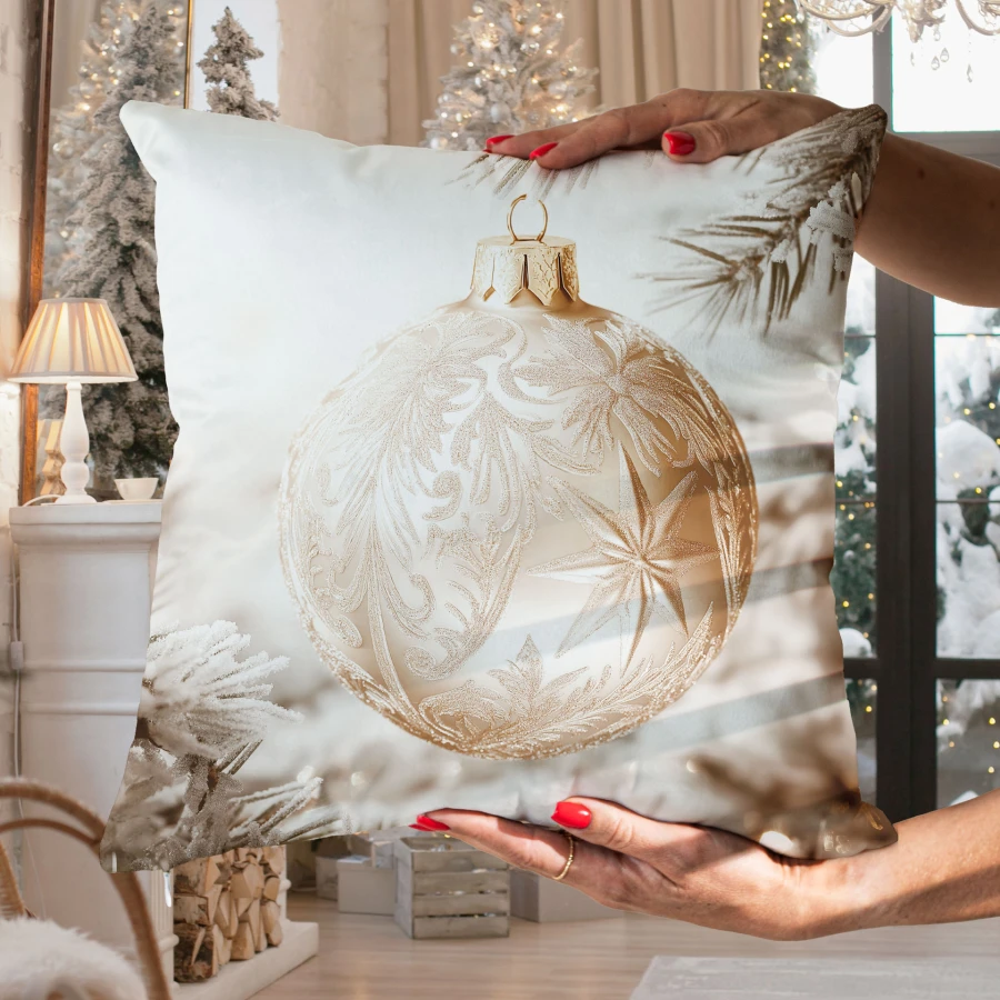 Poszewka ZŁOTA BOMBKA sprawdzi się jako ozdobny element świątecznej aranżacji salonu, sypialni lub pokoju dziennego. Beżowo-złoty odcień i nadrukowany motyw bożonarodzeniowy dobrze komponują się z dekoracjami utrzymanymi w eleganckim, glamour charakterze.