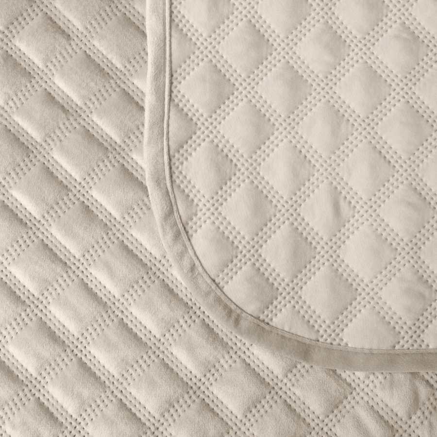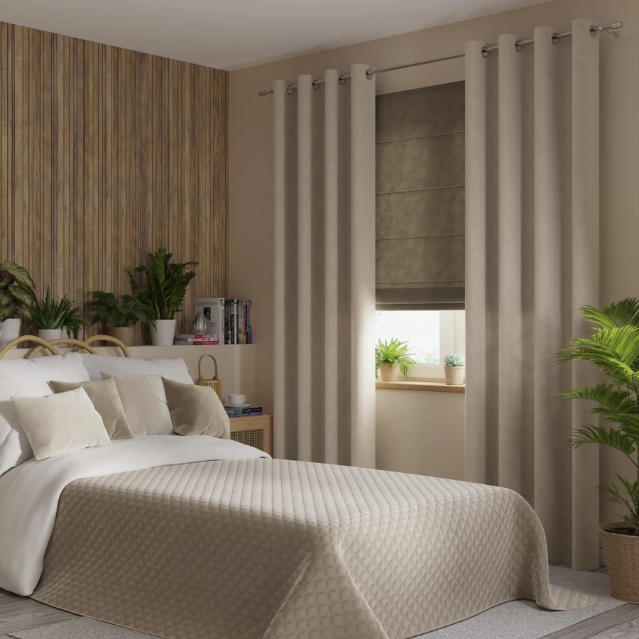 Model VELVI to narzuta w kolorze ciemny kremowy, wykonana z weluru i uszyta w rozmiarze 170x210 cm. Geometryczny wzór widoczny na powierzchni nadaje jej wyrazisty, uporządkowany charakter, a gładkie wykończenie bez dodatkowych zdobień podkreśla estetykę produktu. Narzuta została wykonana w 100% z poliestru, dzięki czemu prezentuje spójną formę i dobrze układa się na łóżku. To dekoracyjny model, który wpisuje się w styl skandynawski i pomaga stworzyć harmonijną aranżację sypialni.