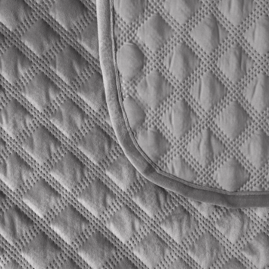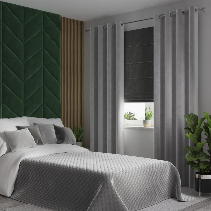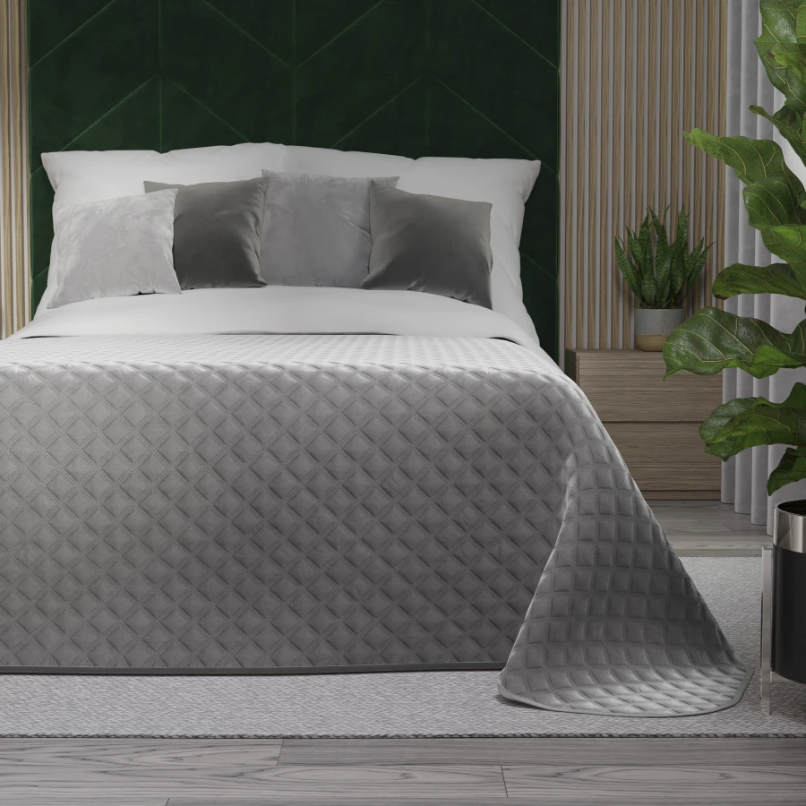 Narzuta VELVI sprawdzi się w sypialni jako dekoracyjne nakrycie łóżka, które pomaga uporządkować przestrzeń i podkreślić charakter wnętrza. Dzięki welwetowej tkaninie, jasnoszarej barwie i geometrycznemu wzorowi będzie odpowiednim wyborem do aranżacji nowoczesnych.