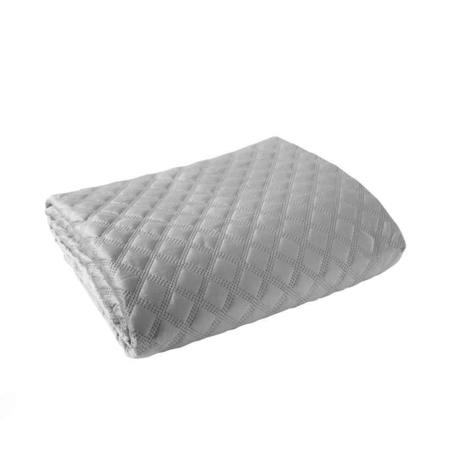 Model VELVI to dekoracyjna narzuta na łóżko wykonana z welwetu w jasnym szarym kolorze. Jej powierzchnię zdobi geometryczny wzór, który nadaje całości uporządkowany i nowoczesny wygląd. Rozmiar 170x210 cm pozwala wygodnie wykorzystać narzutę jako estetyczne wykończenie łóżka w sypialni. Produkt został uszyty z tkaniny o składzie 100% poliester, co przekłada się na spójny wygląd i praktyczne użytkowanie na co dzień.