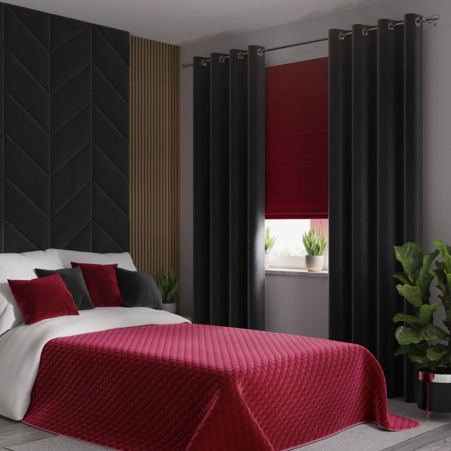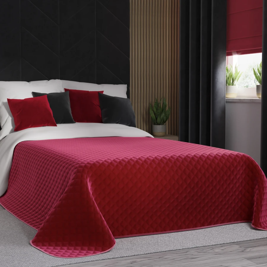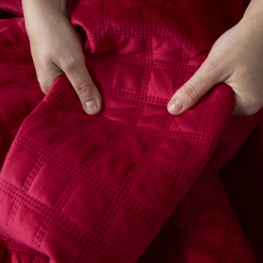 Narzuta VELVI sprawdzi się jako dekoracyjne okrycie łóżka w sypialni. Dzięki czerwonej kolorystyce, welurowej powierzchni i geometrycznemu wzorowi może stać się mocnym elementem nowoczesnej aranżacji. Tolerancja wymiaru wynosi +/- 3%.