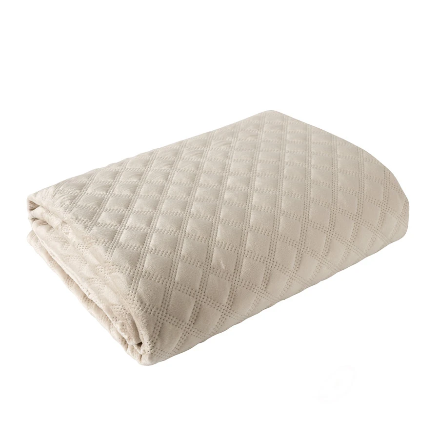 Model VELVI to dekoracyjna narzuta wykonana z weluru w jasnym beżowym kolorze. Geometryczny wzór podkreśla jej nowoczesny charakter i sprawia, że produkt prezentuje się estetycznie oraz elegancko. Rozmiar 70x160 cm pozwala wykorzystać narzutę w różnych aranżacjach, a skład surowcowy 100% poliester wpływa na trwałość materiału. Jasna kolorystyka dobrze komponuje się z wieloma wnętrzami, a welurowa powierzchnia nadaje całości przyjemny wizualnie efekt.