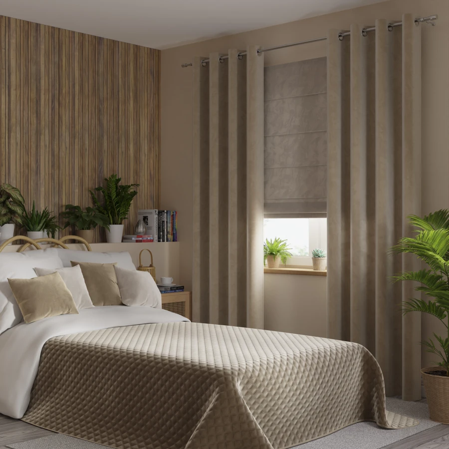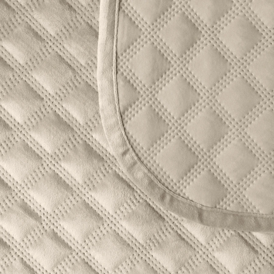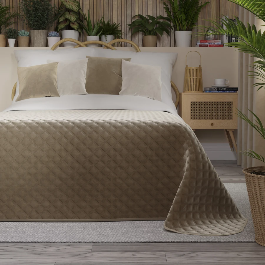 Narzuta VELVI sprawdzi się jako dekoracyjne okrycie łóżka w sypialni. Dzięki welurowej tkaninie, geometrycznemu wzorowi i ciemnemu beżowemu kolorowi stanowi wyrazisty element wystroju w nowoczesnym wnętrzu.