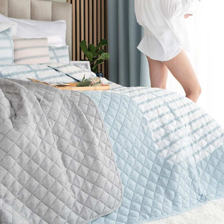 Spójność ze stylem wnętrza skandynawski charakter modelu ułatwia dopasowanie narzuty do nowoczesnej sypialni.