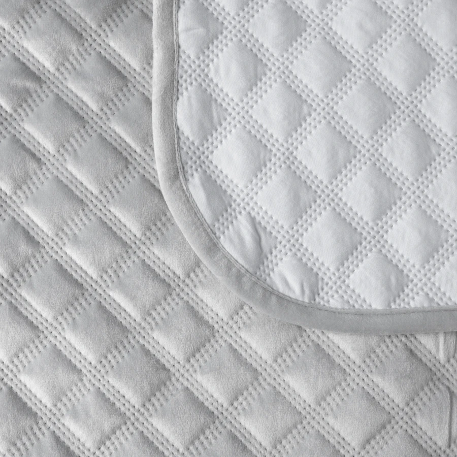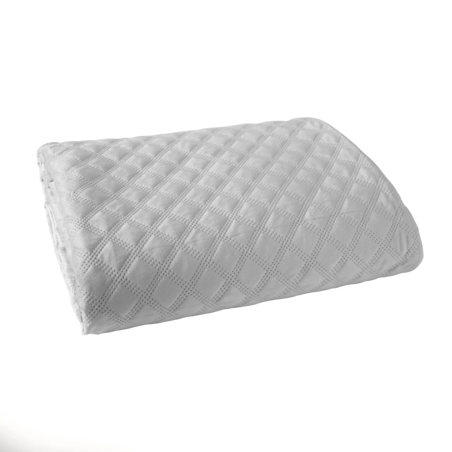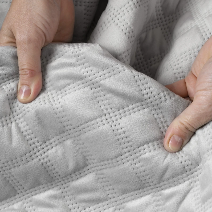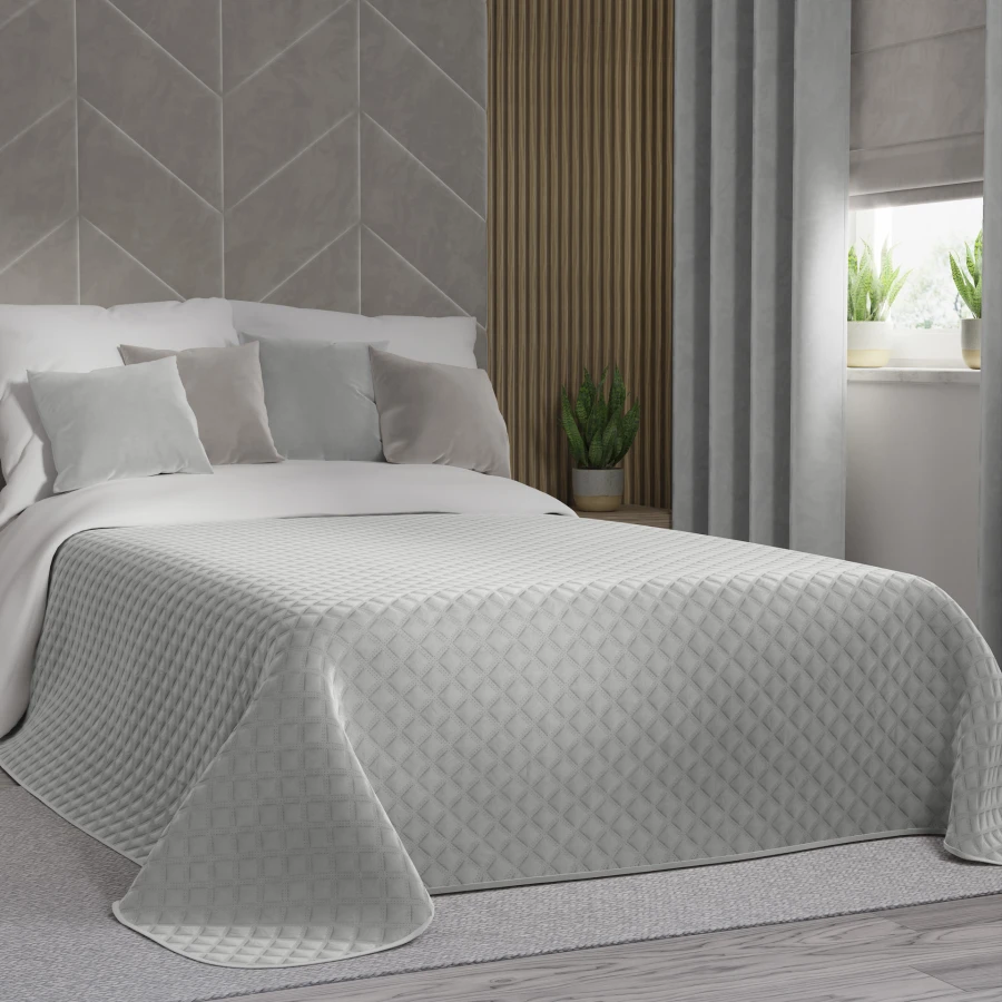 Model VELVI to narzuta dekoracyjna wykonana z welwetu w pastelowym szarym kolorze. Rozmiar 220x240 cm sprawia, że produkt dobrze prezentuje się na łóżku, tworząc spójną i estetyczną oprawę sypialni. Powierzchnia bez dodatkowych zdobień została urozmaicona geometrycznym wzorem widocznym na tkaninie, co podkreśla jej nowoczesny styl. Skład surowcowy 100% poliester wpływa na jednolity wygląd materiału i jego estetyczne wykończenie.