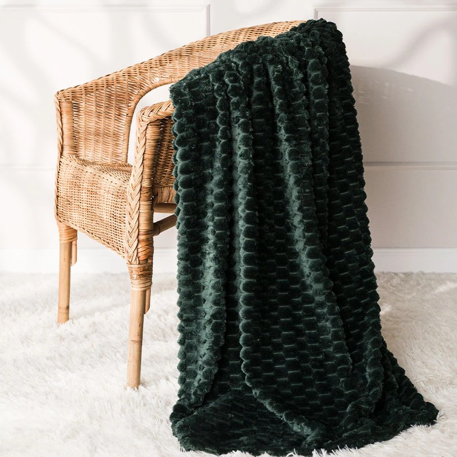 Koc MIKOS może uzupełnić aranżację salonu lub sypialni, wprowadzając głęboki kolor i nowoczesny charakter. Dzięki dużemu rozmiarowi 200x220 cm oraz efektownej fakturze dobrze prezentuje się zarówno w użyciu, jak i po złożeniu.